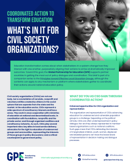 From 2009 to 2019, GPE supported the advocacy activities of national and regional civil society education coalitions in lower-income countries through the Civil Society Education Fund (CSEF), managed by the Global Campaign for Education (GCE), UNESCO and the World Bank.