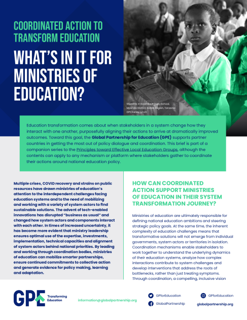 This series of briefs steps into the shoes of different education constituencies to ask, ‘what’s in it for me?’ Each brief aims to generate a better understanding of what can be gained for different groups when they support countries’ education ambitions through coordinated action. The series is part of GPE’s work to mobilize and incentivize education actors, and promote innovative practice, toward system transformation in partner countries.
