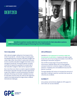 Debt2Ed transforms a partner country's debt repayment into new investments in education. Debt treatments can work either as a debt swap or as a loan buy-down. The Deb2Ed transaction unlocks additional funding from the GPE Multiplier, which increases the resources available for education in the partner country.