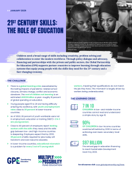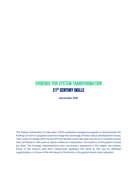 This background research provides an overview of 21st century skills, summarizes the evidence and guidance around their uptake, and makes recommendations for GPE’s engagement with this topic.